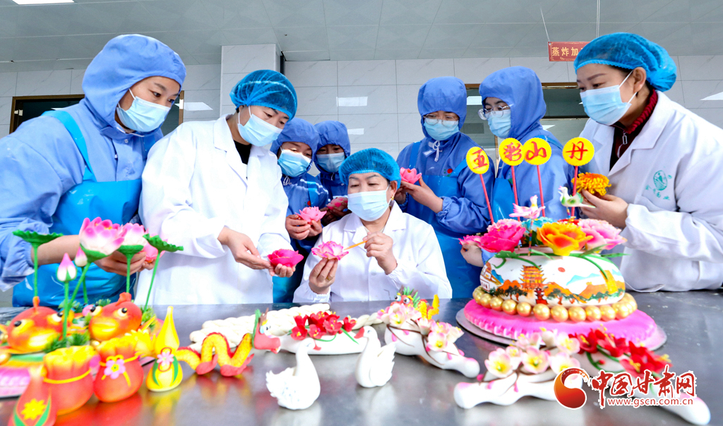 甘肅省張掖市山丹縣一食品加工坊,工作人員正在炸制“糖花子”。