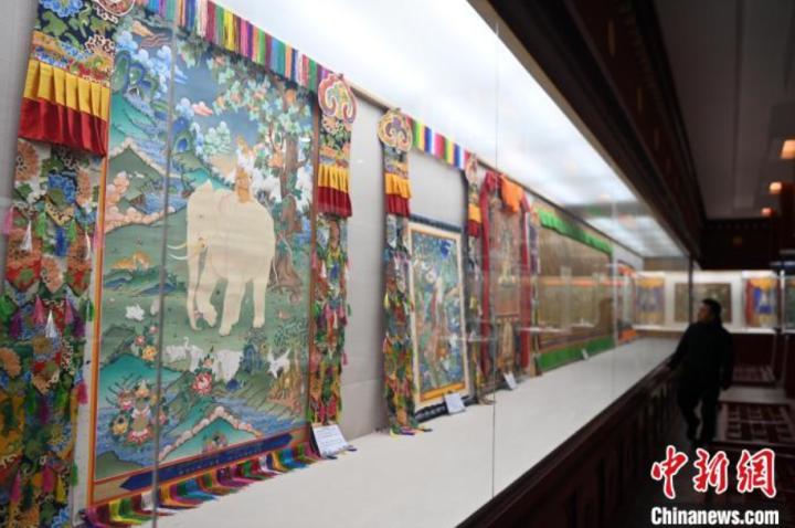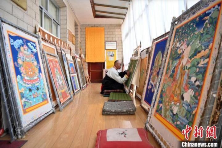精品唐卡展廳展示甘南藏族唐卡國家級代表性傳承人交巴加布,及其父親的唐卡作品,常吸引游人“打卡”。(資料圖)中新社記者 九美旦增 攝