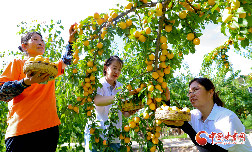 7月15日,甘肅省張掖市甘州區(qū)一專業(yè)合作社的特色林果種植基地內(nèi),金黃色的杏梅掛滿了枝頭,工作人員正在采摘成熟的杏梅。