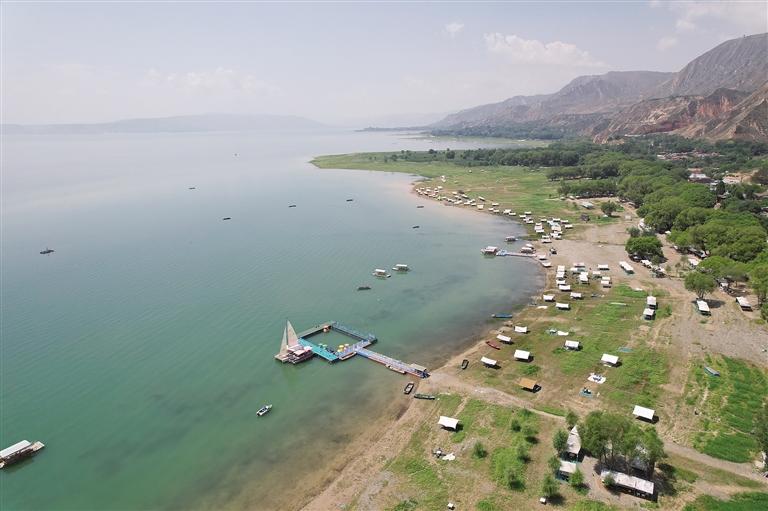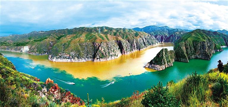 提及永靖劉家峽,第一反應(yīng)就是一個(gè)成語——“涇渭分明”。受上游降水影響,洮河河水比較渾濁,在與黃河交匯處劉家峽水庫的清波“相遇”時(shí),形成一清一黃兩股水流,河流呈“Y”字形交匯。交融卻不滲透,加上河中的石山,猶如兩條巨龍游戲于此,在當(dāng)?shù)剡@一景象也被稱為“二龍戲珠”。初秋時(shí)節(jié),來自全國(guó)各地的游客站在黃洮交匯觀景臺(tái)上,感受這份來自大自然的震撼與壯美,從高處遠(yuǎn)眺入河口,“黃河清,洮河黃”,可謂“涇渭分明”,景色極為壯觀。