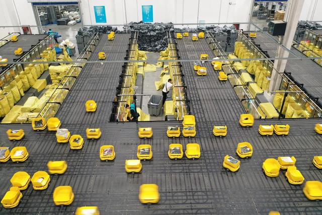 11月7日,浙江省湖州市德清縣乾元鎮(zhèn)第一產(chǎn)業(yè)智慧物流園區(qū)快魚服飾有限公司華東物流中心,800余臺分揀“小黃人”機器人在精準(zhǔn)配送各類服飾(無人機照片)。新華社發(fā)(倪立芳攝)