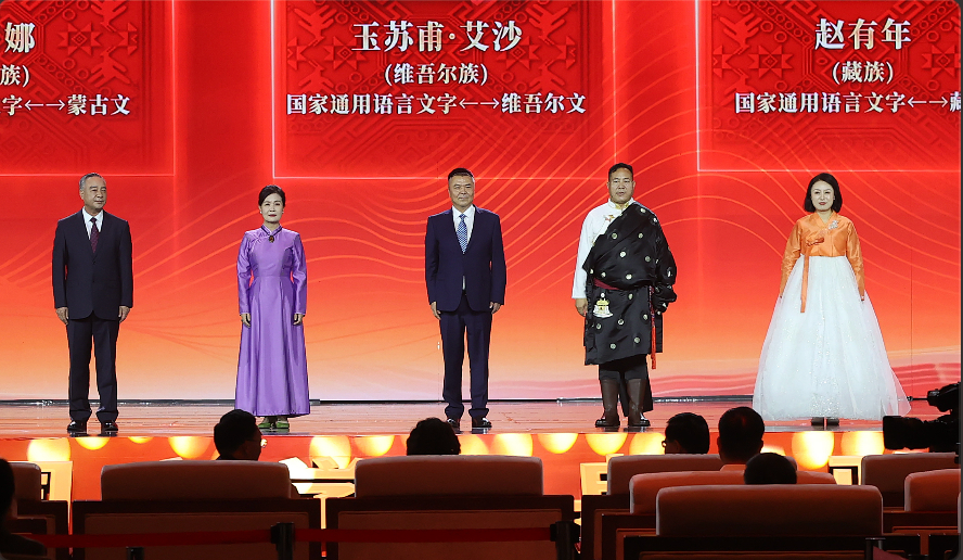 艾布、朵日娜、玉蘇甫·艾沙、趙有年、鄭風(fēng)淑領(lǐng)取第十三屆全國少數(shù)民族文學(xué)創(chuàng)作駿馬獎翻譯獎。