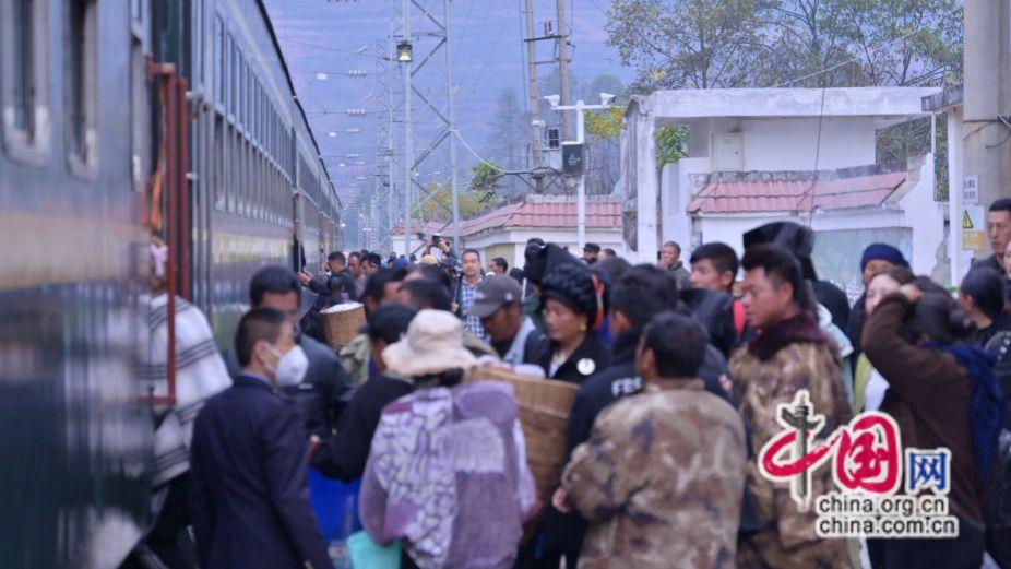 2024年11月20日,彝歷新年第一天,成昆線5633次慢火車停靠在站臺,彝族同胞有序乘車。原波 攝