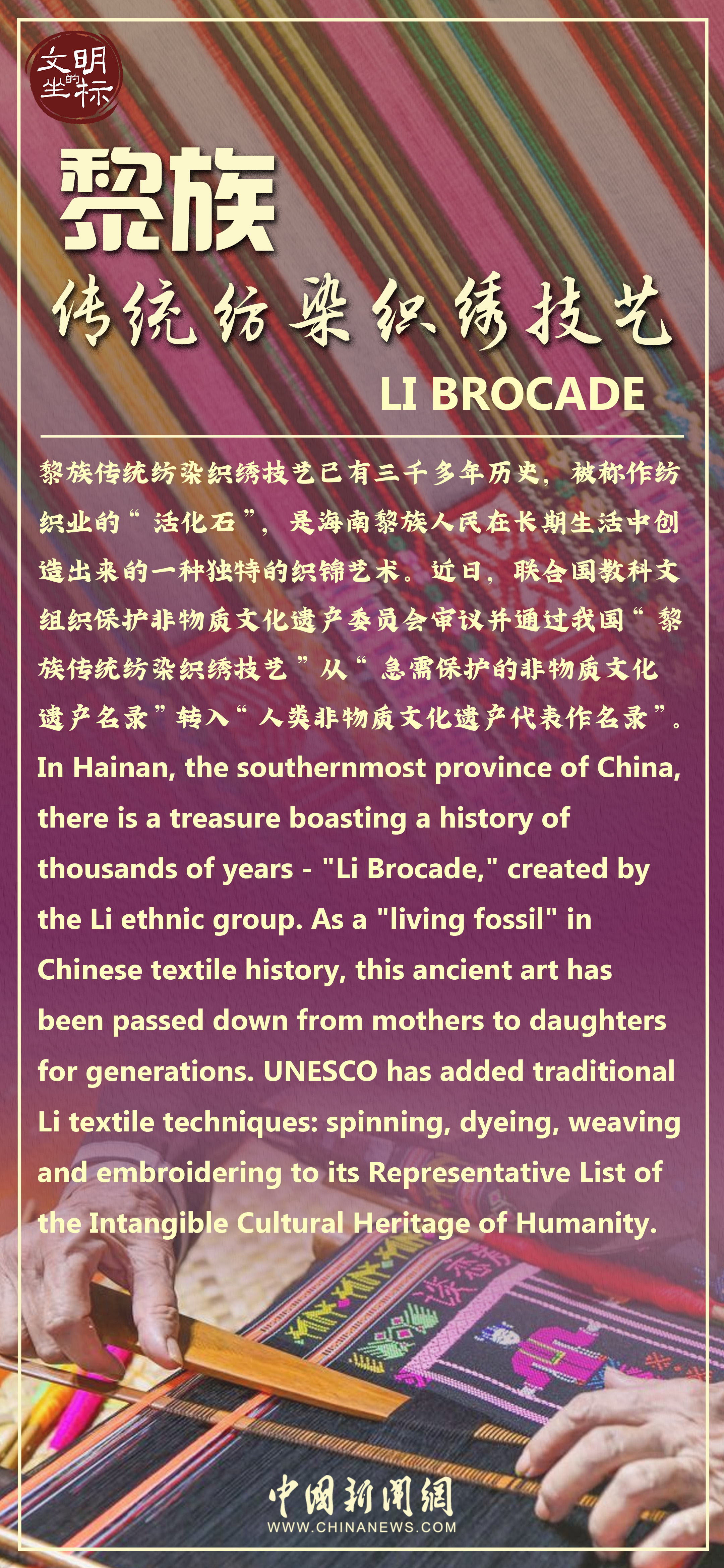 日前,黎族傳統(tǒng)紡染織繡技藝從聯(lián)合國教科文組織“急需保護的非物質文化遺產名錄”轉入“人類非物質文化遺產代表作名錄”,引發(fā)關注。黎族傳統(tǒng)紡染織繡技藝已有三千多年歷史,被稱作紡織業(yè)的“活化石”。對于沒有創(chuàng)造文字的黎族,黎錦像是一本“史書”,寫就了這個民族的文化和智慧。早在新石器時代,海南島上的黎族先民已會使用工具制作繩索或絲線。西漢時期,已織造出精美的“廣幅布”。至宋代,黎族的紡織達到很高水平。元代,黎族紡織工藝已傳至全國。黎族傳統(tǒng)紡染織繡技藝有麻織、棉織、織錦、印染(包括扎染)、刺繡、龍被等品種,以色彩鮮艷、圖案多樣、工藝精湛而聞名。如今,古老黎錦正穿越歷史長河,以時尚化、潮流化、年輕化的設計形態(tài)融入現(xiàn)代日常生活。