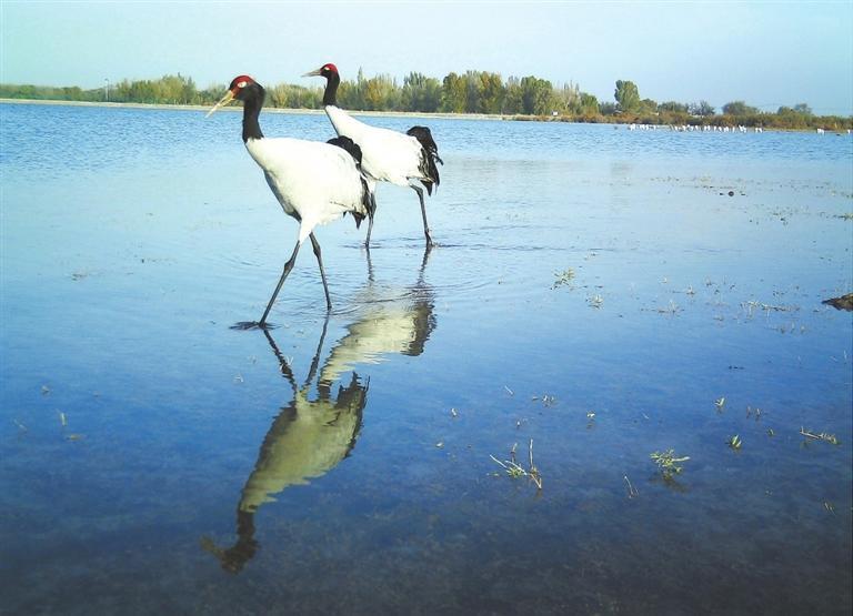 黑頸鶴在甘肅安西極旱荒漠國(guó)家級(jí)自然保護(hù)區(qū)棲息。新甘肅·甘肅日?qǐng)?bào)通訊員 徐媛媛