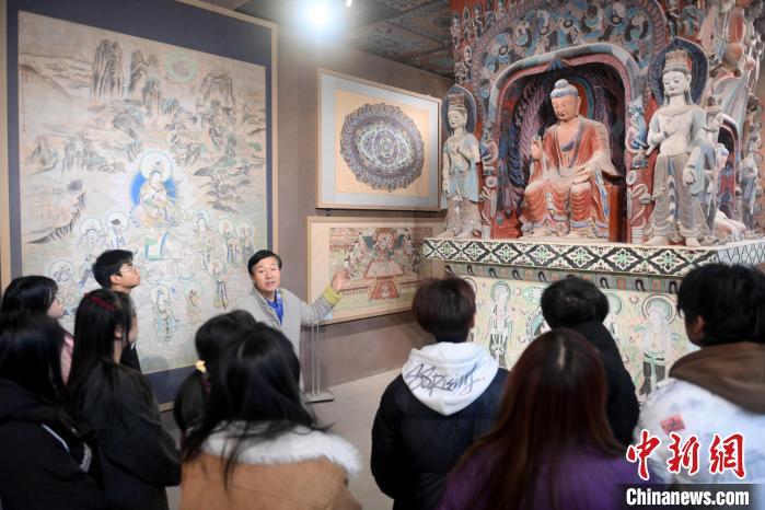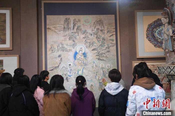 1月14日,甘肅省酒泉市,甘肅酒泉職業(yè)技術學院非物質(zhì)文化遺產(chǎn)敦煌彩塑技藝傳習所內(nèi),學生們參觀敦煌壁畫作品。中新社記者 李亞龍 攝