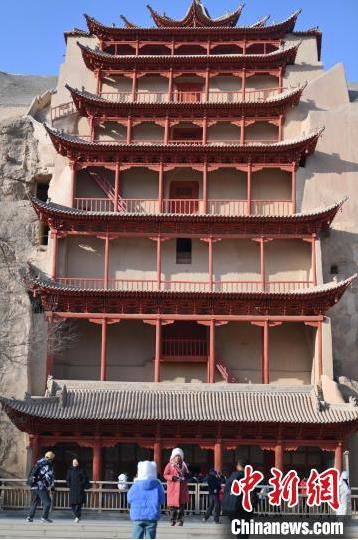 1月13日,甘肅敦煌莫高窟景區(qū)內(nèi),游人在莫高窟標(biāo)志性建筑九層樓前拍照打卡。中新社記者 李亞龍 攝