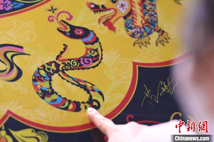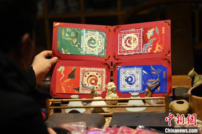 1月10日,在甘肅省敦煌市敦煌畫(huà)院內(nèi),游人參觀由敦煌畫(huà)院設(shè)計(jì)授權(quán)的中國(guó)郵政《敦煌福蛇》極限型明信片。中國(guó)郵政《敦煌福蛇》極限型明信片從敦煌壁畫(huà)里的藻井汲取靈感,集合敦煌紋樣、民藝剪紙等中國(guó)傳統(tǒng)藝術(shù)內(nèi)容,以春萌蛇、夏長(zhǎng)蛇、秋實(shí)蛇、冬藏蛇對(duì)應(yīng)著四季祝福。中新社記者 李亞龍 攝