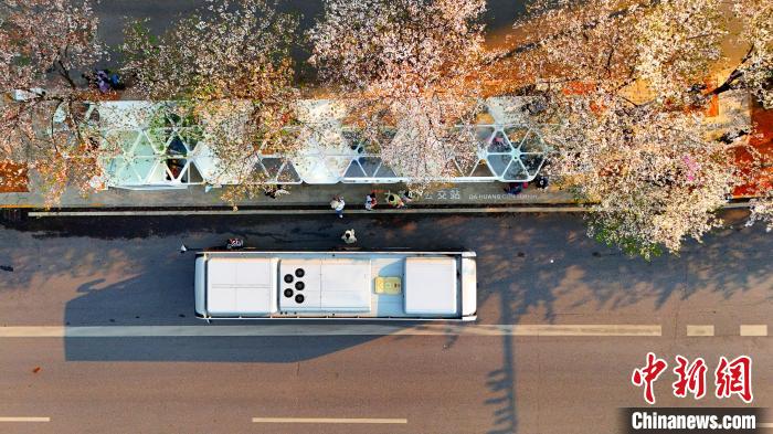 3月26日,被譽(yù)為武漢“最美櫻花車站”的珞喻東路大黃村公交站櫻花盛放。經(jīng)過改造的大黃村公交站,新增了自助售貨機(jī)、衛(wèi)生間、共享充電寶等便民設(shè)施,煥然一新的科技智慧站臺(tái)與粉白如霞的櫻花相映生輝。微風(fēng)吹過,櫻花花瓣浪漫飄零,吸引不少市民游客觀賞“打卡”。圖為公交車在珞喻東路大黃村公交站停留。(無人機(jī)照片)劉康 攝