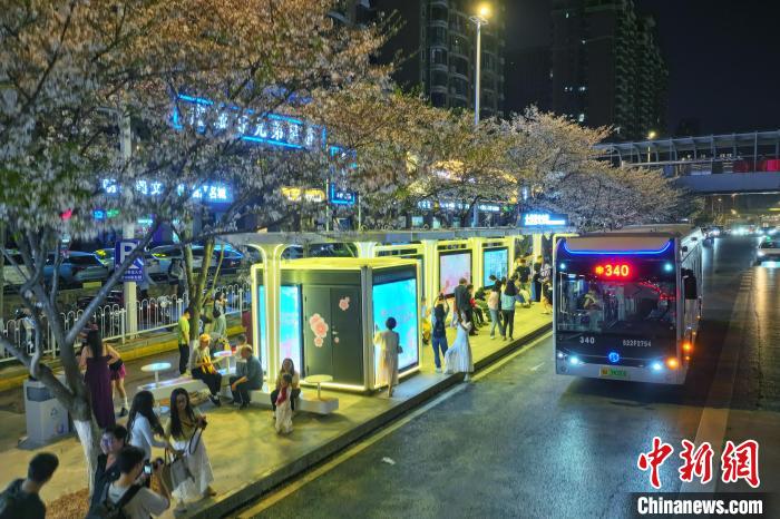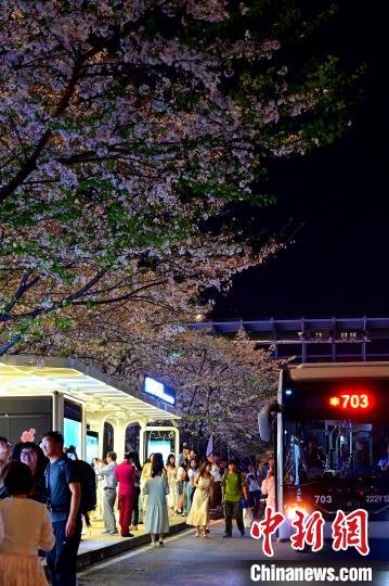 圖為夜間的珞喻東路大黃村公交站,櫻花在光影中呈現(xiàn)別樣魅力。劉康 攝