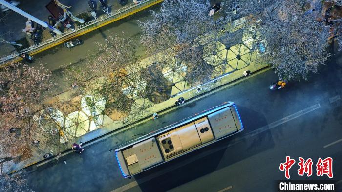 圖為夜間的珞喻東路大黃村公交站,櫻花在光影中呈現(xiàn)別樣魅力。(無人機(jī)照片)周星亮 攝