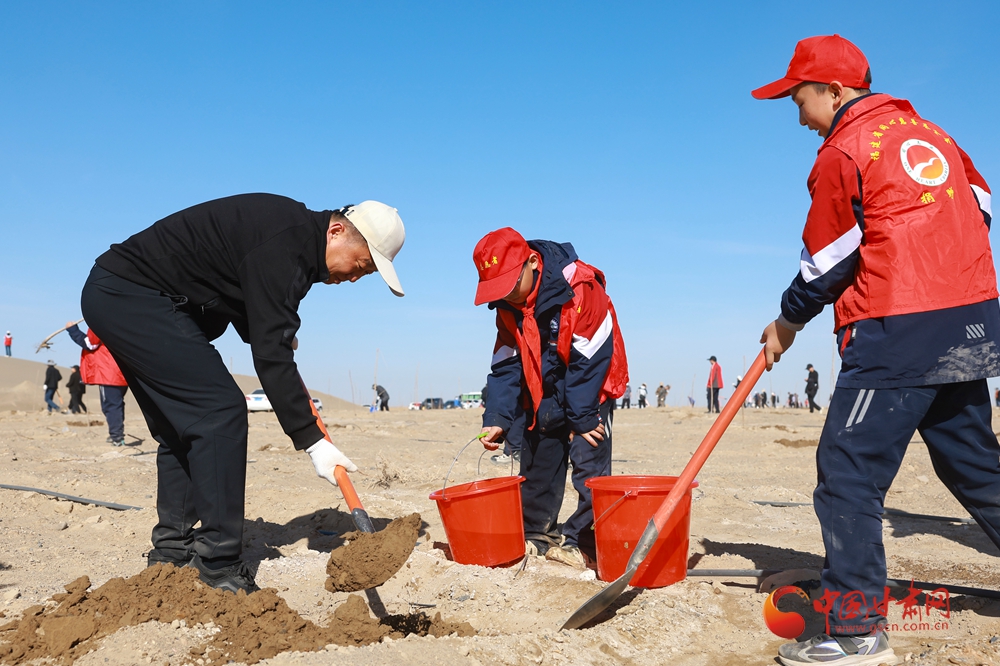 4月9日,酒泉市金塔縣金核公路城西義務植樹基地,來自酒泉市直機關和金塔縣的干部職工以及學生開展義務植樹活動。