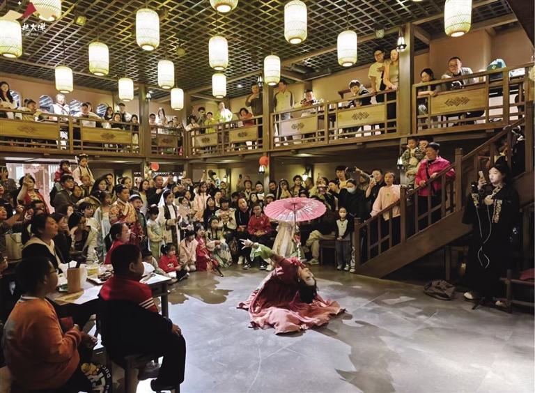 “諸位小友近來可好?”“好!”在街區(qū),NPC們與游客的互動成為一大亮點。為了讓游客更好地沉浸其中,街區(qū)里的“蘭裳閣”專門提供服裝出租和妝造設(shè)計服務(wù)。游客們在這里換上漢服、做好造型,“穿越”成古人與NPC們共同沉浸在這場歷史旅行中。張偉彥在“龍門客棧”工作快半年了,飾演店小二馬一刀。他對角色有著自己的理解:“導(dǎo)演讓我演店小二,大家印象里店小二都是機(jī)靈、腿腳快的。但我演的這個店小二帶著江湖氣息,他藏在龍門客棧,其實是個刀客,在這里打工是為了打探消息,畢竟龍門客棧可是江湖消息的聚集地。”記者走在街區(qū),時不時就能看到他拿著草帽,熱情地招呼游客玩接帽子游戲。遇到靦腆不敢嘗試的游客,他也會不斷鼓勵,有時候碰上外國游客,他還隨口說幾句英語與其互動。