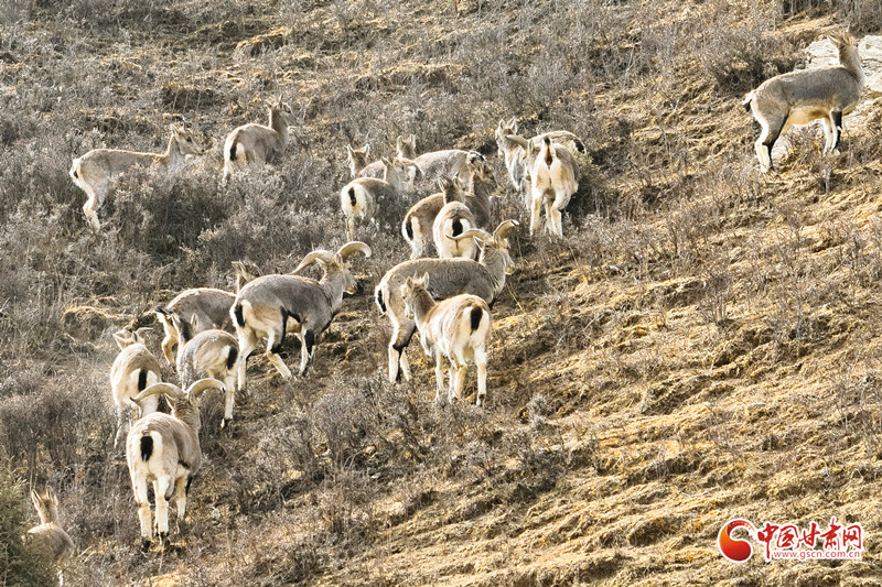 畫面中,頭羊領(lǐng)隊(duì),群羊于峭壁山坡間或奔或走、尋覓食物。巖羊灰褐皮毛與巖壁融為一體,盡顯和諧之美。其體型中等,形態(tài)介于野山羊與野綿羊之間,作為青藏高原常見野生動(dòng)物,常年棲息于海拔2000米至6000米的高山裸巖地帶,屬國家二級(jí)重點(diǎn)保護(hù)野生動(dòng)物。巖羊堪稱“巖壁上的精靈”,擅長懸崖穿梭,警惕性極高,難以靠近。其蹄堅(jiān)硬且具防滑紋理,能在近乎垂直巖壁穩(wěn)穩(wěn)立足、敏捷跳躍。