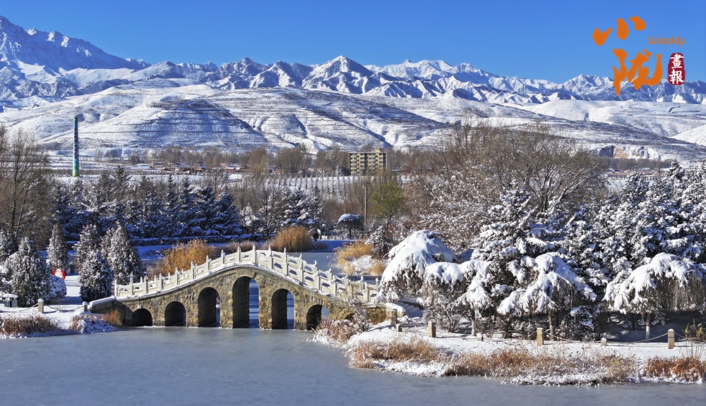 雪后初霽,銀白的民樂公園,在陽(yáng)光下熠熠生輝,安靜且神秘,與遠(yuǎn)處綿延的祁連山構(gòu)成一幅璀璨的畫卷。