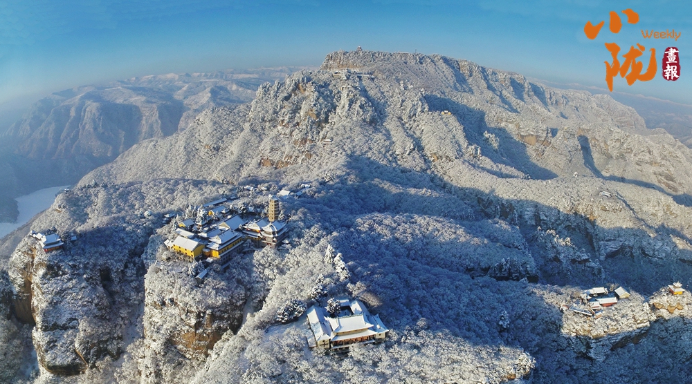 群山裹素,起伏的線條在極致湛藍的天穹下舒展,積雪壓彎枝頭,形成道道玉弧。而點綴其間的廟宇樓閣,默然佇立,飛檐上的殘雪泛著微光,與這片寧靜的藍白色調(diào)共同構(gòu)成一幅和諧、安詳?shù)男麓貉┚啊?/p>