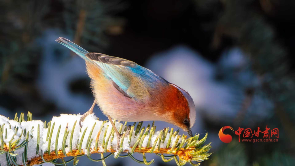 這群被譽(yù)為“祁連山精靈”的小鳥,頭頂雪白羽冠蓬松如絨,仿佛戴上了一頂天然的小絨帽,棕紅面頰溫潤似玉,在陽光下泛著柔和的光澤,藍(lán)綠背羽如同上好的寶石,在雪色映襯下泛著金屬般的質(zhì)感。淡粉與橙白相間的腹羽柔和雅致,層次分明,在純白背景的映襯下,形成強(qiáng)烈而和諧的視覺碰撞,它們或亭亭立于覆雪松枝,或靈巧穿梭于松針間隙,更有靈動的個體俯身探喙,啄取松針縫隙里的昆蟲,一聲輕脆的啄擊,劃破林間的清寂,卻更顯山野幽靜,羽翼輕振間,將“雪中覓食”的鮮活圖景永久定格。
