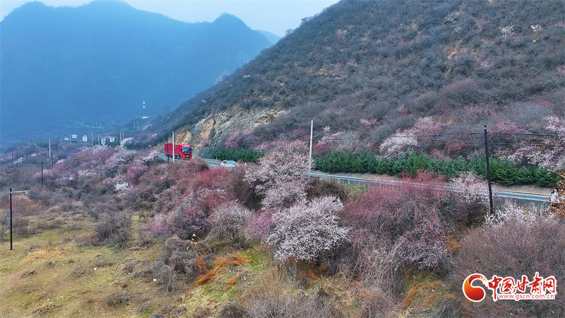 桃花朵朵開,如粉色綢帶纏繞在翠綠山間