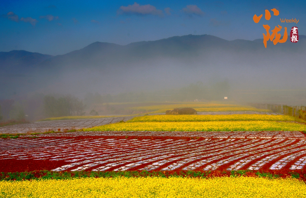 晨霧漫過(guò)山巒,梯田鋪展成彩色織錦,黃花似金浪翻涌,紅花如霞錦鋪陳,遠(yuǎn)山含黛,天地間滿是春日的鮮活與詩(shī)意。